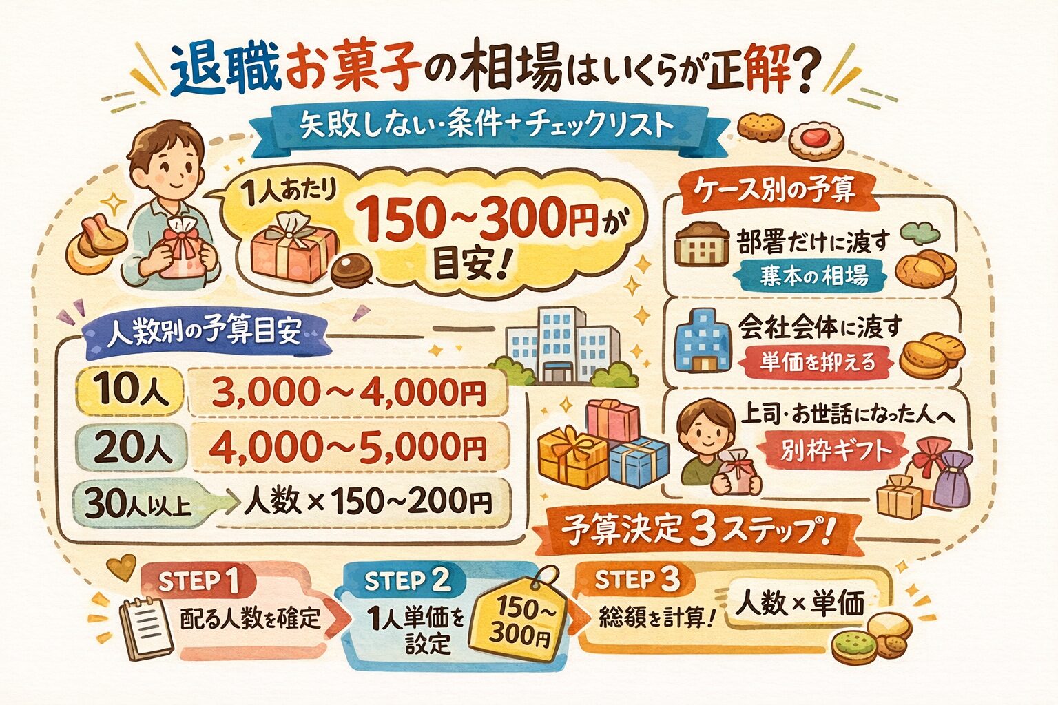 退職お菓子の相場は、この「人数 × 150〜300円」の範囲で調整すれば、家計に無理なく、かつ失礼のない準備ができます。